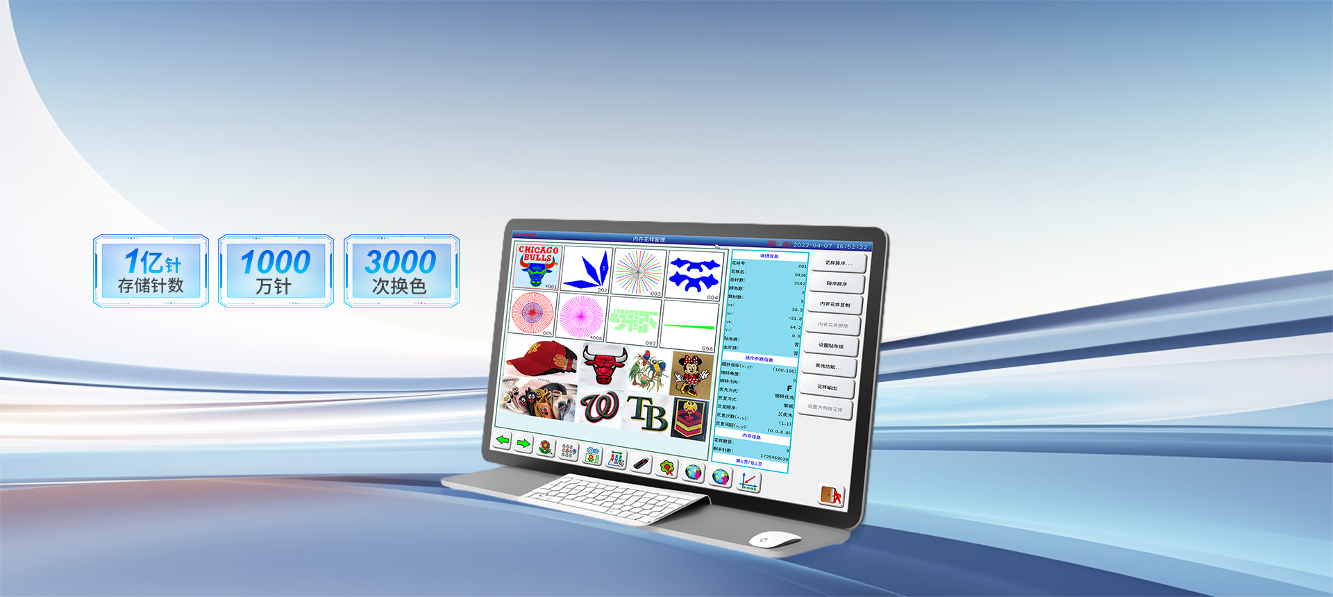 存儲針數(shu)達1億針,單(dan)箇(ge)花(huā)樣可(kě)達1000萬針、3000次換色,滿足複雜花(huā)樣設(shè)計(ji)需求